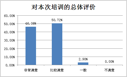为了进一步了解培训的效果和质量,在培训结束后,教师教学发展中心对本次培训进行了满意度问卷调查。共发放问卷69份,回收有效问卷69份。在这69份问卷中,关于老师们对本次培训的总体评价方面,回答“非常满意”的有34人,“比较满意”的有35人,回答“一般”的有2人,回答“不满意的”0人。