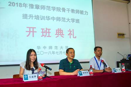 郭主任老师首先对各位老师对本次培训工作的支持表示谢意、对华师的各位领导、老师和班主任的辛勤工作表示感谢。郭主任说,豫章师院也是一所百年老校,但在本科教学方面,它是非常年轻的,可以说是萌萌哒,刚一周岁,在学科建设、科研发展方面还要多多向华师相关专家请教与学习。郭主任表示,这次培训的课程时间短、紧凑、符合豫章师院的实际需求,是难得的学习的机会。老师们要积极研讨、认真听课,真正做到眼到、耳到、笔到、心到,必要时 嘴到。最后,郭主任希望老师们珍惜机会,好好享受此次学术大餐,学有所获、满载而归。