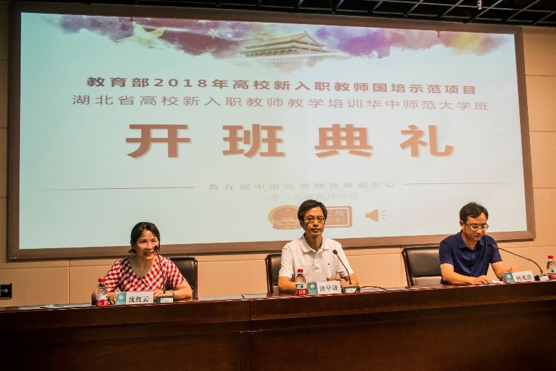 9月3日上午8点,来自湖北省属32所高校共计143名新入职教师齐聚我校管理综合大楼103报告厅,参加“教育部2018年高校新入职教师国培示范项目——湖北省高校2018年新入职教师教学能力提升培训班”开班典礼。出席开班典礼的还有我校教师教育学院院长洪早清、湖北省高师师资培训中心副主任何兆清、华中师范大学教师教学发展中心沈红云。
