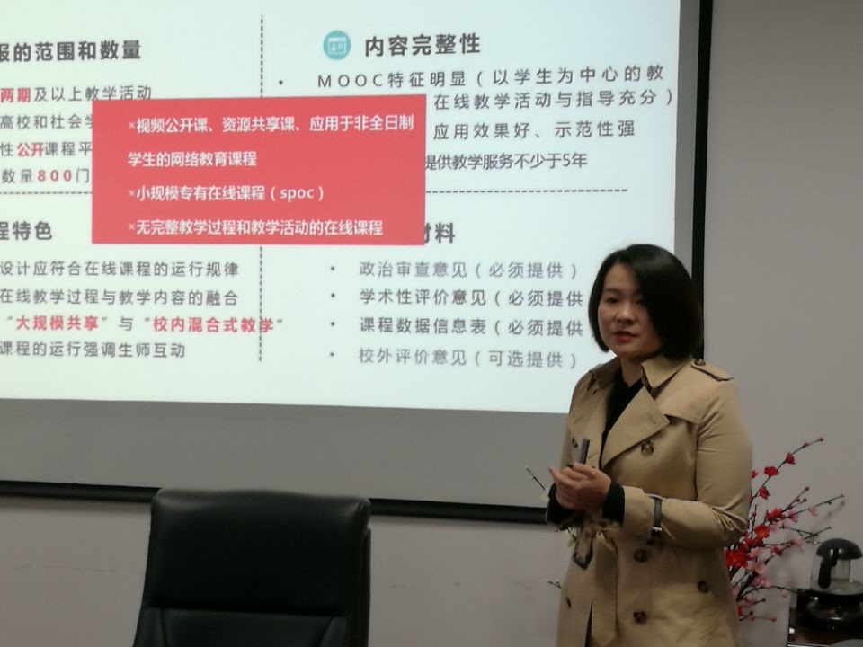 为了更好地解答老师们的各种困惑,来自超星武汉分公司的课程总监孔鑫凯结合近两年的国家在线开放课程申报,为大家进行了政策解读,剖析了课程建设中需要注意的问题。她从去年湖北省国家级在线开放课程的申报概况说起,通过对比2017、2018两年的申报政策,为大家分析了教育部对在线课程建设的政策导向。进而借助去年获批国家级精品在线开放课程的成功案例,从拍摄好、设计佳、富媒体、平台全记录、重运营等五个方面对老师们的在线课程建设提出了许多具有针对性和可操作性的建议,特别提醒计划明年参加申报的老师要格外注意团队建设和时间把控。围绕她所提出的建议,与会的老师们进行了热烈的讨论和交流,许多有过建设经验的老师,更将自己碰到的问题、走过的弯路和盘托出,供大家借鉴反思。经过学习和讨论,老师们感到受益匪浅,纷纷表示已做好准备,将此次讲座中学到的内容应用到自己的MOOC和SPOC课程的建设中。