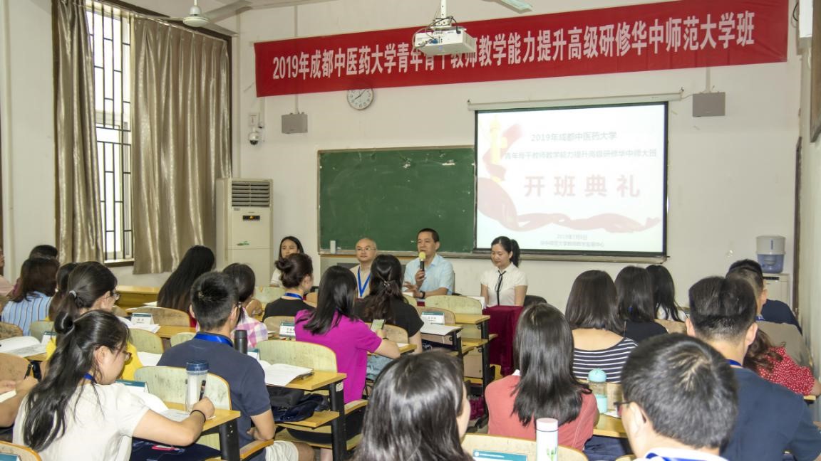 2019年7月8日上午,七月的江城,荷香阵阵,成都中医药大学青年骨干教师教学能力提升高级研修班开班典礼在华中师范大学教师教育学院A107教室举行。参加开班典礼的领导有华中师范大学教师教学发展中心执行主任、博士生导师吴军其教授,成都中医药大学教师发展中心主任、人事处副处长杨胤清,以及成都中医药大学39名骨干教师。开班典礼由教师教育学院副教授、培训班班主任罗忻主持。