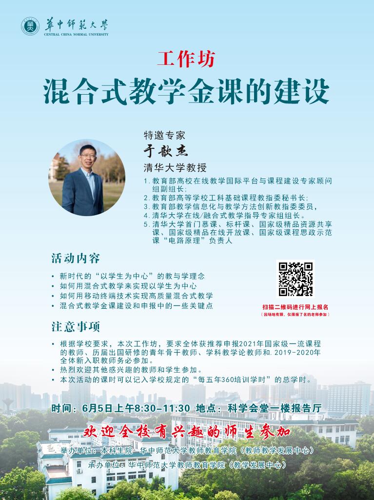 为了贯彻执行教育部印发的《关于一流本科课程建设的实施意见》和《“双万计划“国家级一流本科课程推荐认定办法》文件精神及我校教师建设和申报“国家一流本科课程”的愿望和要求,教师教育学院教师教学发展中心拟于2021年6月邀请清华大学于歆杰教授来校开展《混合式教学金课的建设》工作坊。